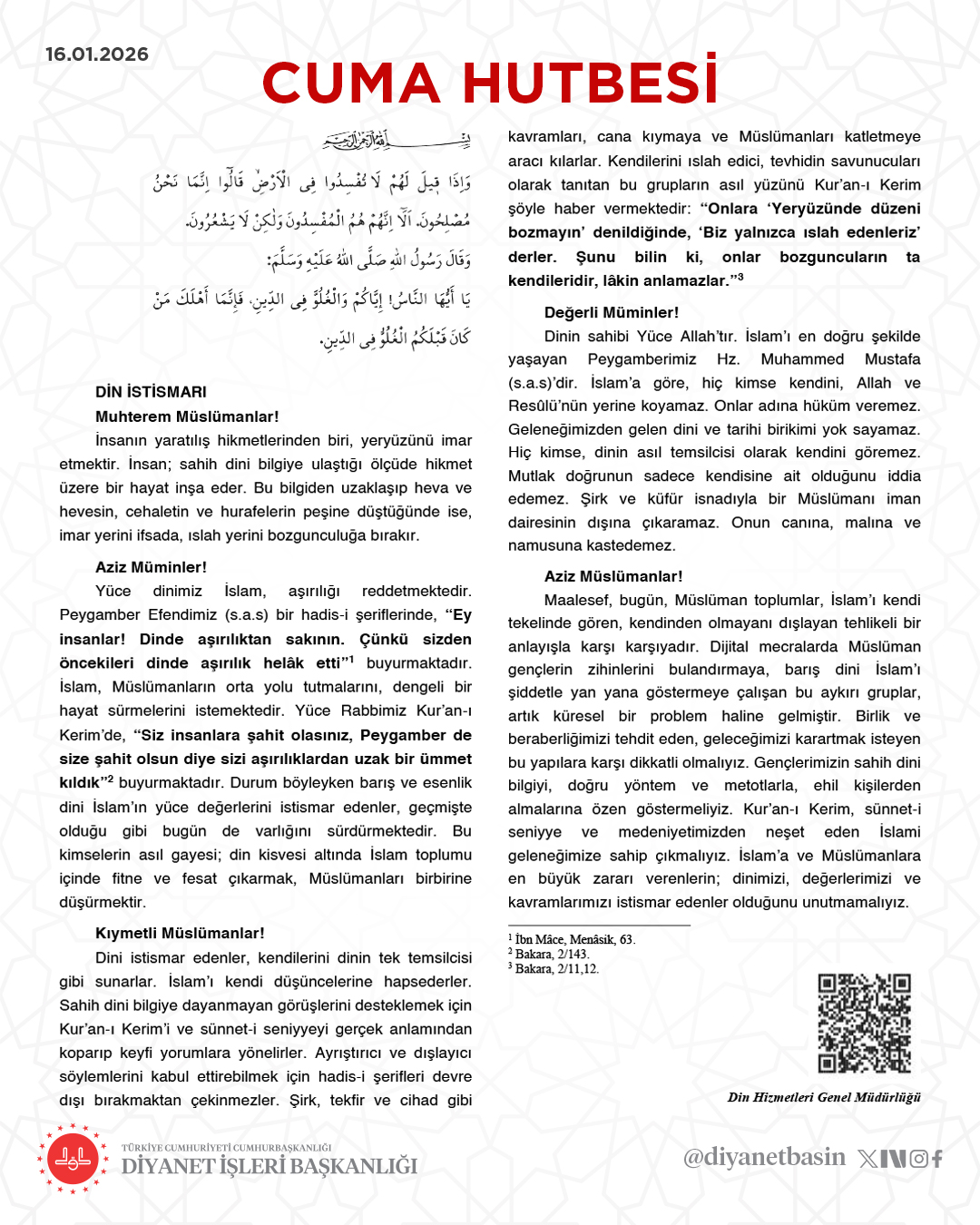 Hutbede, insanın yaratılış hikmetlerinden birinin yeryüzünü imar etmek olduğu belirtilerek, sahih dini bilgiye dayanmayan anlayışların ıslah yerine fesadı, birlik yerine ayrışmayı beslediği kaydedildi. Dini bilgiden uzaklaşıp heva ve hurafelerin peşine düşenlerin toplumsal barışı zedelediğine dikkat çekildi.