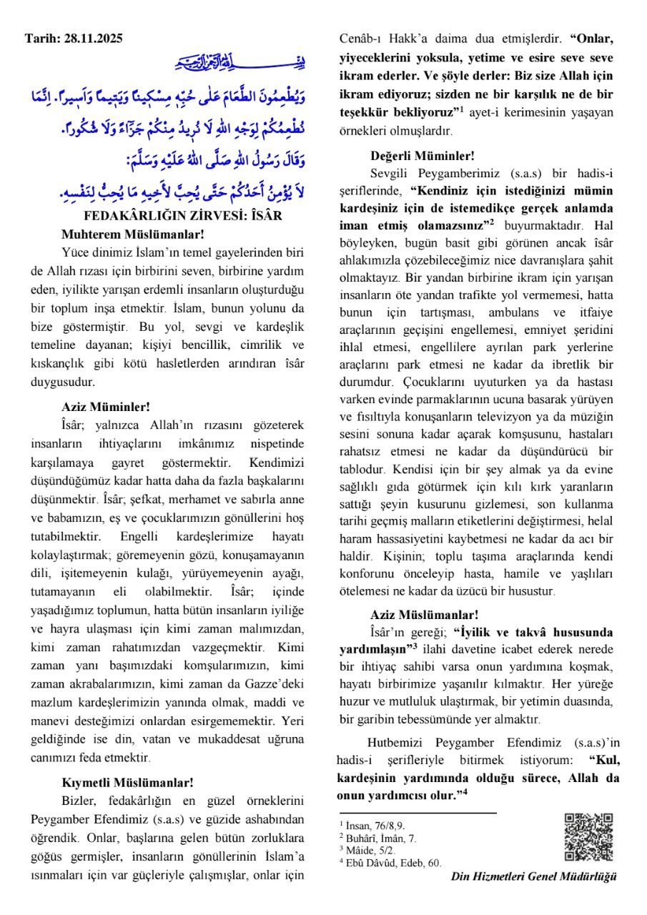 Diyanet İşleri Başkanlığı tarafından hazırlanan ve 28 Kasım 2025 Cuma günü yurt genelindeki camilerde okunan hutbenin ana teması, İslam ahlakının en yüksek mertebelerinden biri olan îsâr (diğerkâmlık) oldu. Hutbede, Müslümanların Allah rızasını gözeterek bencillik, cimrilik ve kıskançlık gibi kötü hasletlerden arınmaları gerektiği belirtildi.