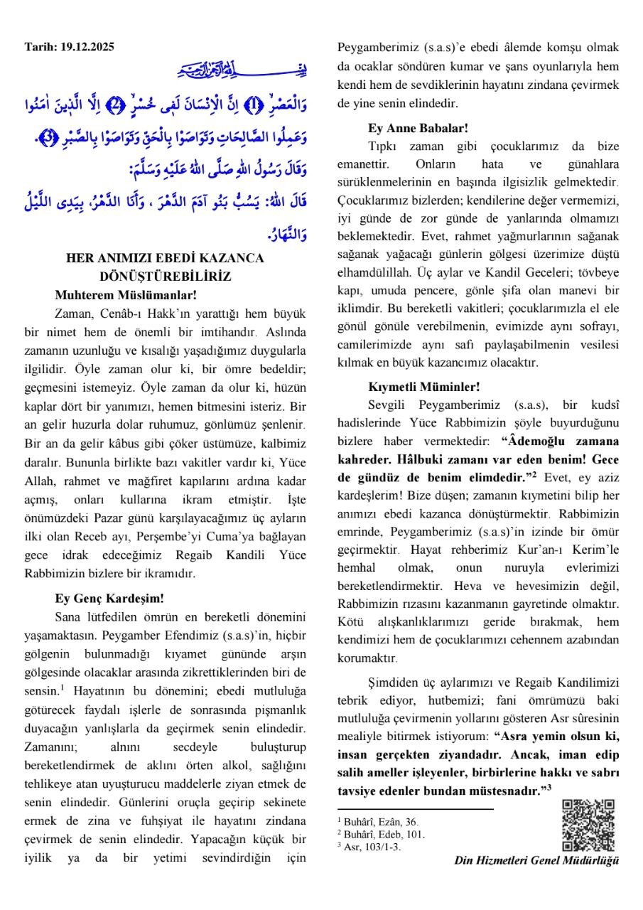 Türkiye genelindeki camilerde irad edilen haftanın hutbesinde, zamanın sadece bir akış değil, Allah tarafından sunulan büyük bir nimet ve imtihan olduğu vurgulandı. Zamanın uzunluğunun veya kısalığının hislerle değişebileceği belirtilirken, bazı anların bir ömre bedel olduğu ifade edildi. Özellikle önümüzdeki Pazar günü başlayacak olan Receb ayı ve Perşembe’yi Cuma’ya bağlayan gece idrak edilecek Regaib Kandili'nin, Allah’ın kullarına sunduğu özel bir rahmet iklimi olduğu hatırlatıldı.