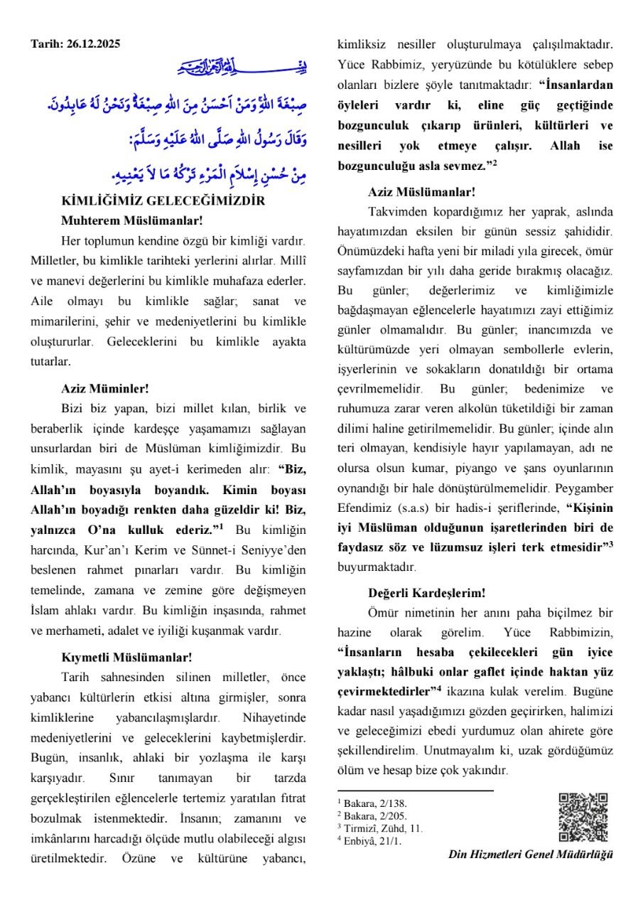 Diyanet İşleri Başkanlığı tarafından hazırlanan ve Türkiye genelindeki camilerde irat edilecek 26 Aralık 2025 tarihli Cuma hutbesi yayımlandı. "Kimliğimiz Geleceğimizdir" başlığıyla sunulan hutbede, toplumsal kimliğin bir milletin bekası için en temel unsur olduğu vurgulanırken, yaklaşan yeni yıl öncesinde önemli uyarılar yapıldı.