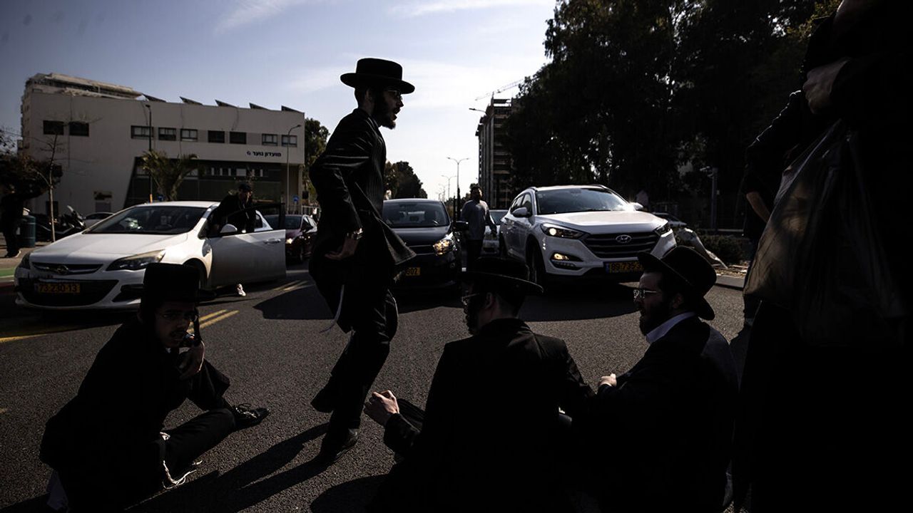 Geleneklerine uygun siyah takım elbise, beyaz gömlek ve fötr şapka takan Harediler, caddeyi trafiğe kapatarak protesto eylemi gerçekleştirdi.
