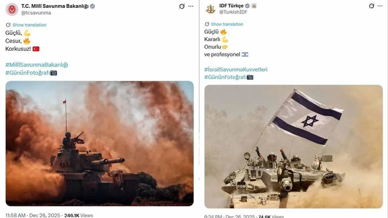 Sosyal medyada algı operasyonları yürüten İsrail ordusu (IDF), Türkiye Cumhuriyeti Milli Savunma Bakanlığı'nın (MSB) paylaşımını taklit etmeye kalkışınca alay konusu oldu. MSB'nin 26 Aralık'ta Türk tankının heybetli görüntüsüyle paylaştığı "Günün Fotoğrafı" gönderisi, saatler sonra İsrail'in propaganda hesapları tarafından kopyalandı.