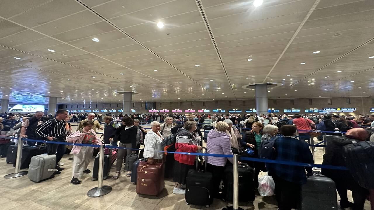 [İsrail’deki Ben Gurion Havalimanı’nda tahliye bekleyen yolcuları ve artan güvenlik önlemlerini temsil eden görsel]