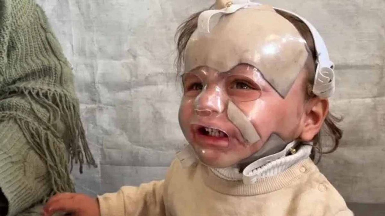 Yanıkların ardından oluşan "vahşi doku" büyümesini engellemek için yüzüne özel bir plastik maske takmak zorunda kalan küçük Muhammed, günde 20 saat bu "yüz zırhı" ile yaşıyor. Annesi Gadir, imkansızlıklar içinde güçlükle temin edilen bu maskenin, oğlunun yüzünün daha fazla deforme olmaması için tek çare olduğunu belirtiyor.